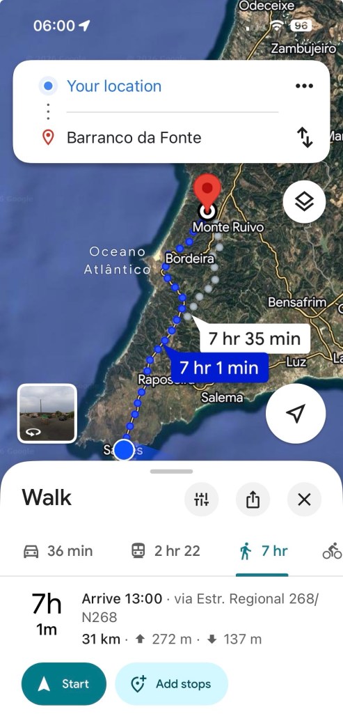 Tomorrow we head for a hostel called Barranco da Fonte, 31 km north of the Cape (according to Google Maps!)
