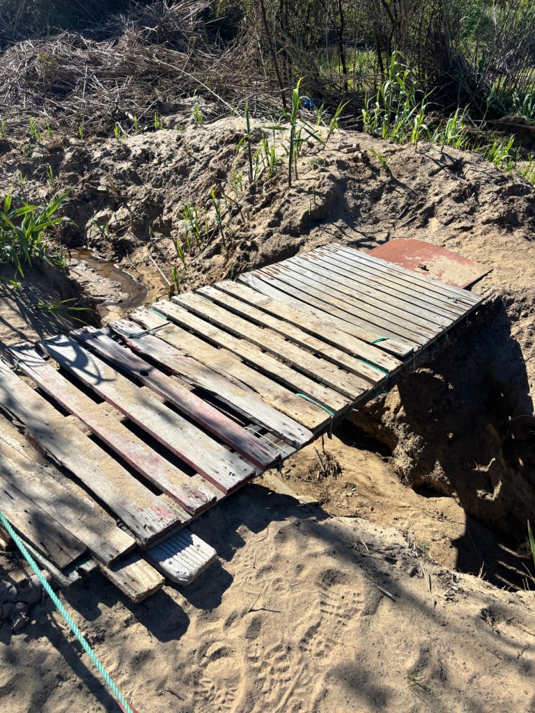 We cautiously took precautions on the ‘pallet path’, to ford the stream that only weeks before, had washed away the bridge.