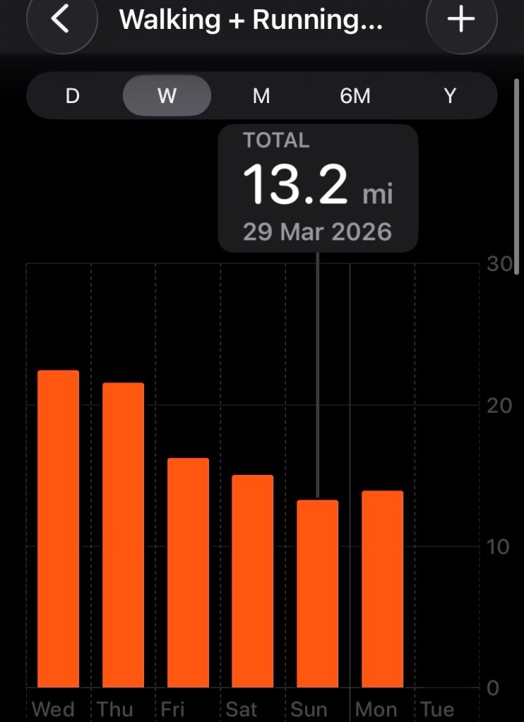 Yesterday we walked a more modest 29,000 steps 13.9 miles.