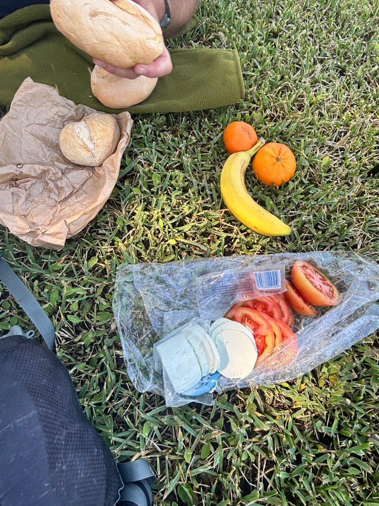 Tomato’s, bread, “goats cheese from the mountains” and a very childish (schoolboy humour) pattern of satsumas and banana.