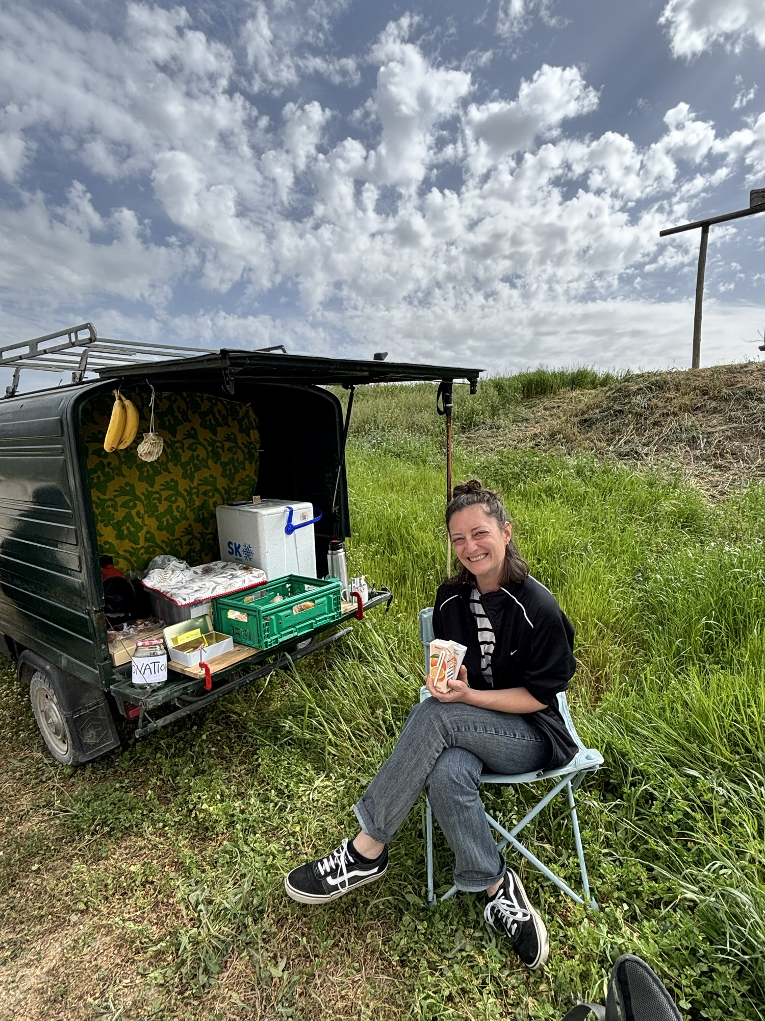 Sat trail side alongside the Vespa she had travelled in, Paola was selling snacks and drinks by donation only.