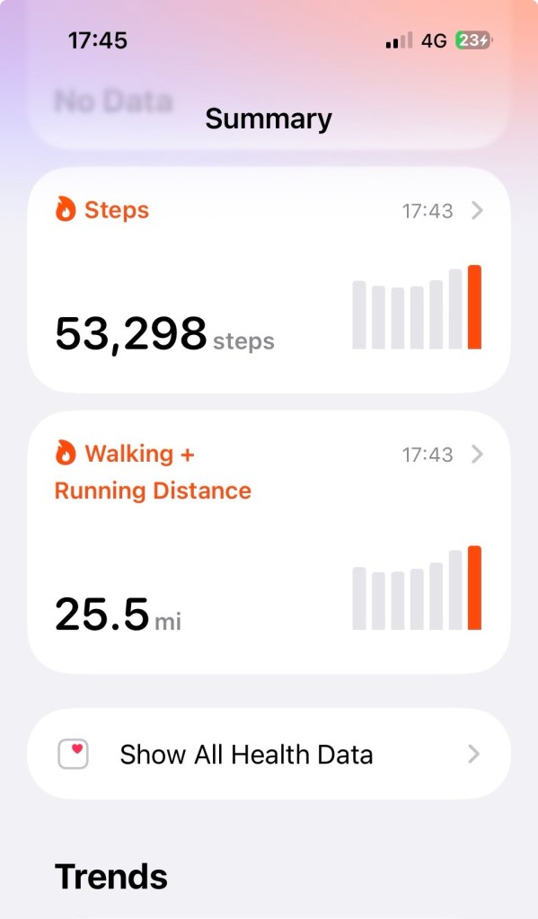 I can now make my target tomorrow, meet my wife Nicky at the airport at 1.30 and then enjoy 4 days of no walking in a lovely European city. 😜