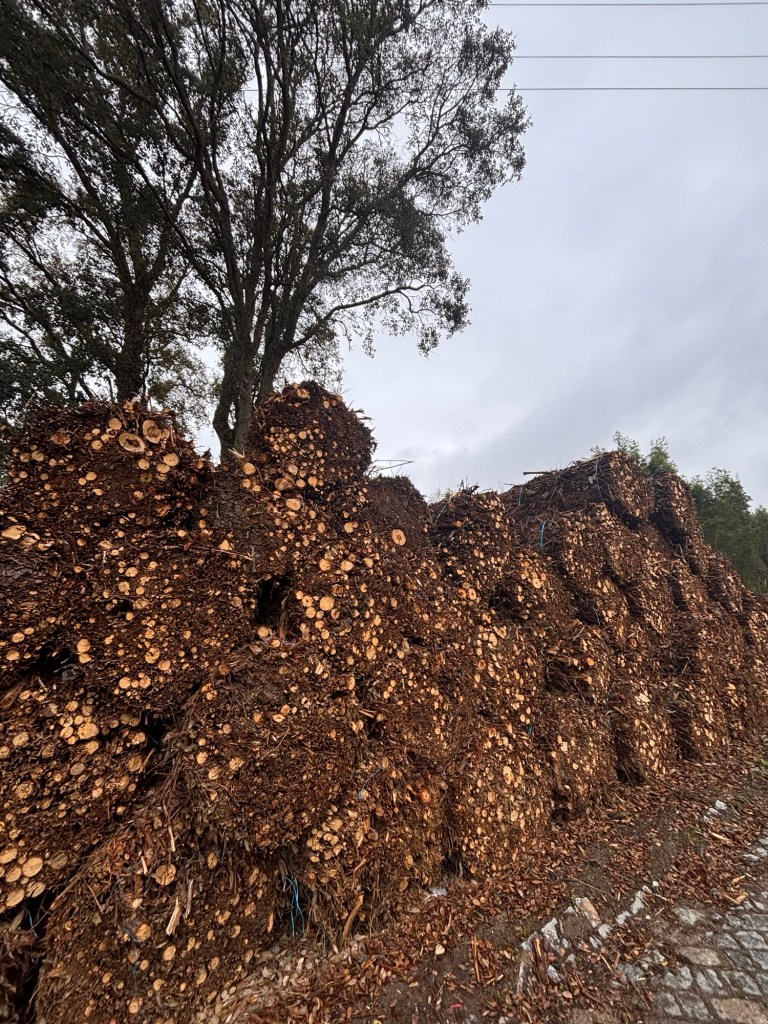 Piles of kindling, strapped up, ready to go..
