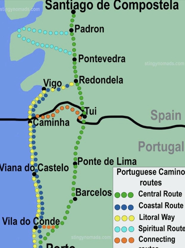 Lizzie and I are walking the Littoral (yellow) route, which hugs the coastline for 80% of the trail to Vigo, before they all combine to take the Peregrinos towards Santiago.