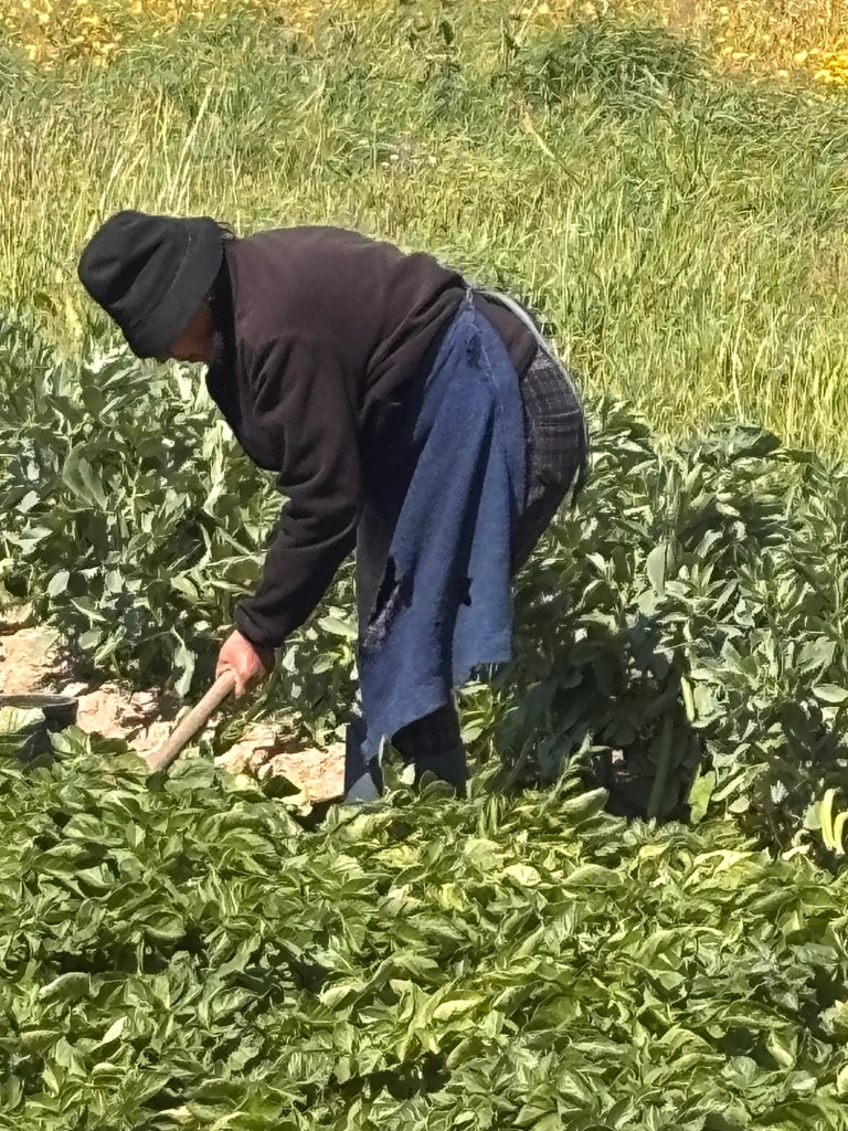 A little old lady, dressed in black, toiled in the fields, her legs bent with age and graft.