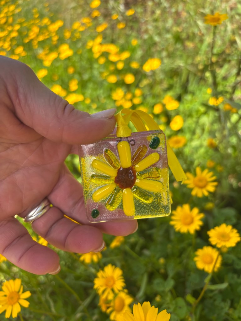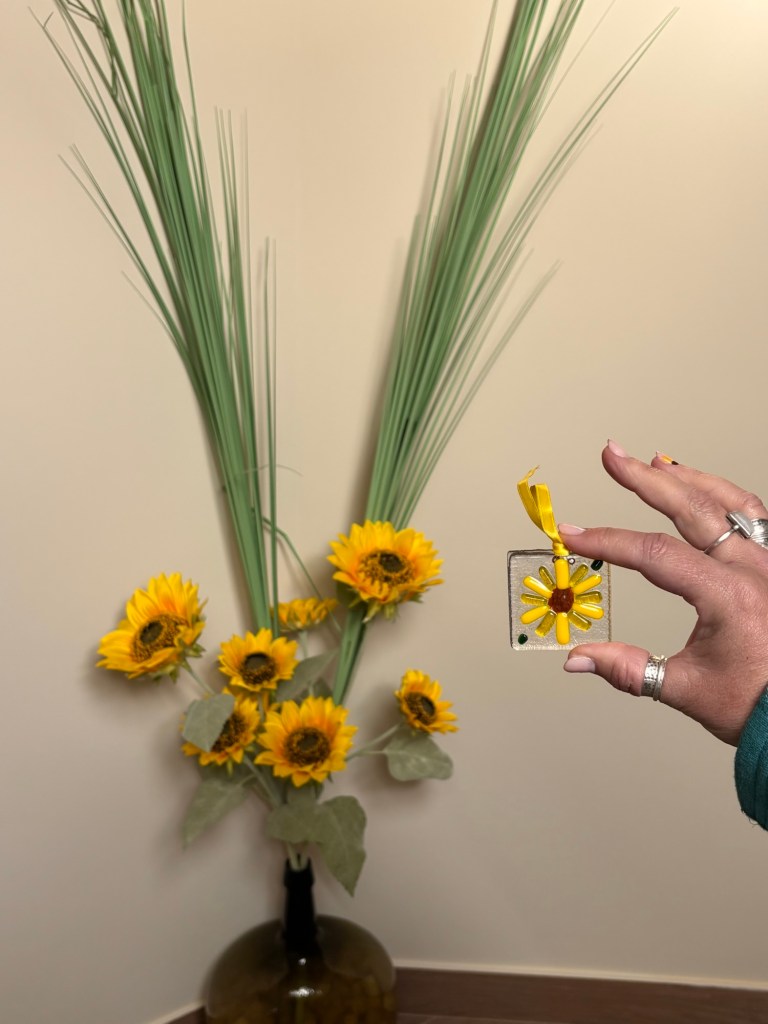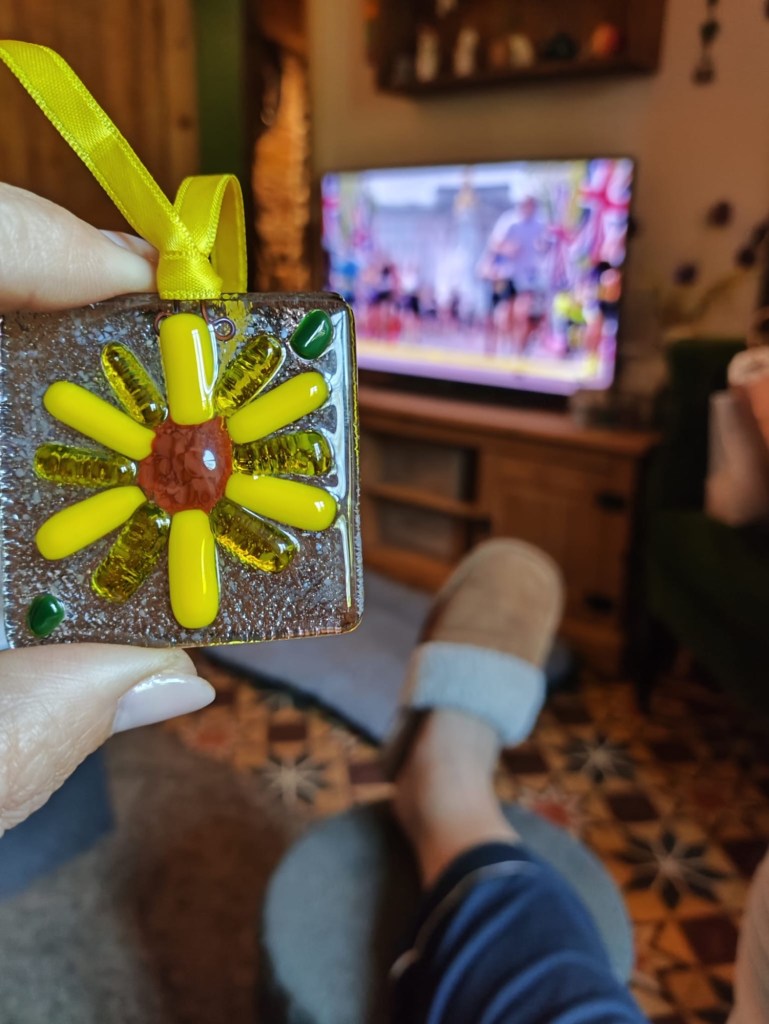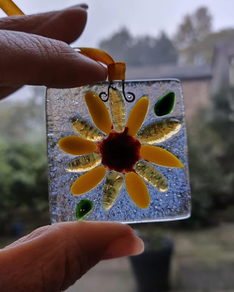 Glass sunflowers, fused by Lizzie, Hannah’s mum, have become the symbol of her life and her charity.
